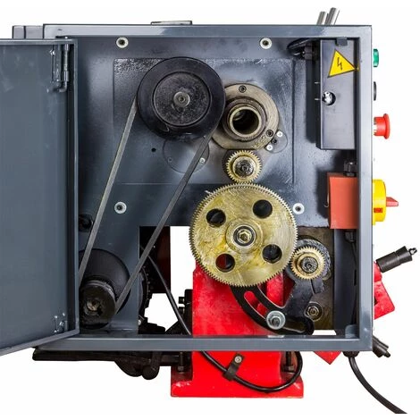 Dank Getriebeantrieb mit 9 Geschwindigkeitsstufen, einfach und bequem durch die beiden oberen Hebel einstellbar, ist keine umständliche und schmierige Verstellung der Stufenriemenscheibe notwendig. Die Umstellung der Vorschubeinrichtung erfolgt über ein Wendeherz.