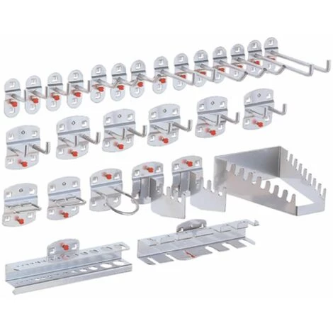Hakensortiment für Wände mit 10 x 10 mm Quadratlochung • Anwendung: Individuelle Halterung für Werkzeuge und Teile in Lochblechwänden mit einer Qudratlochung 10 x 10 mm. Achsabstand 38 mmdie Haken werden einfach in die gewünschte Lochung eingehängt und mit der roten Kunststoffschraube arretiert • Lieferung: Schraube im Lieferumfang enthalten