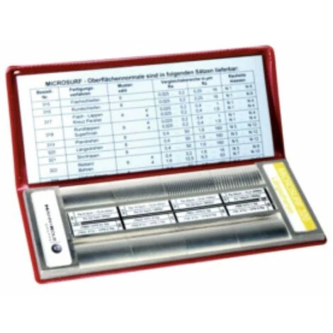 Oberflächen-Vergleichsmuster für abtragende Bearbeitungsverfahren • Anwendung: Oberflächen-Vergleichsmuster, zur Beurteilung der Oberflächen-Rauheit durch einfachen Sicht- und Tastvergleich nach DIN ISO 4287, DIN ISO 4288, BS 2634 und ANSI B 46.1. • Ausführung: verschleißfest und nichtrostendVergleichsgrößen Ra und Rz • Vorteil: galvanoplastisch hergestellt, für hohe Genauigkeit und Gleichmäßigkeit • Lieferung: im Etui