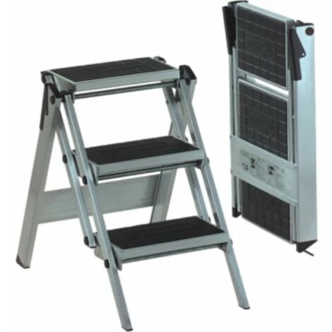Sicherheitstreppe aus Aluminium, klappbar • Ausführung: breite trittsichere Stufen für beidhändig freies ArbeitenTrittflächen mit geriffelten Kunststoffplatten bezogen für rutschfesten Standeinfach zusammenklappbar zu flachem, platzsparendem FormatBez.-Nr. 032-044 mit Sicherheitsbügel
