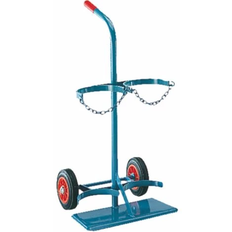 Materialkarre für Stahlflaschen mit Sicherungskette • Anwendung: Zum Transport von zwei 20 l Stahlflaschen. • Ausführung: mit Vollgummi-Bereifung. Kettensicherung und Standplattezum Transport von Stahlflaschenmit PVC-Handgriff
