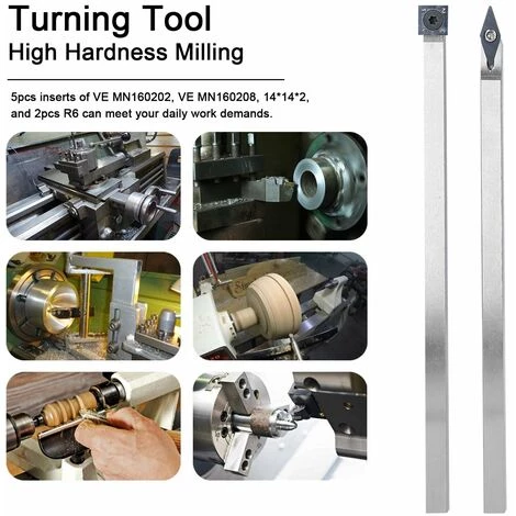 Dies ist ein Satz aus hochwertigem Drehwerkzeug und Aluminium-Aluminium-Griffsatz, perfekt für Vorschlicht- und Endbearbeitungen. Feine Zähigkeit und Härte mit langer Lebensdauer. 5-teilige Einsätze von VE MN160202, VE MN160208, 14 * 14 * 2, und 2 Stück R6 können Ihre täglichen Arbeitsanforderungen erfüllen.Vierkantstahl-Dorn-Design, wodurch es steifer ist und weniger wahrscheinlich rollt als Werkzeuge mit rundem Schaft.Qualitätsgriff aus Aluminiumlegierung, nimmt schnelles und einfaches Spann- und Austauschsystem an, benötigt nur einen Schraubenschlüssel und einen Schraubendreher Vervollständigen Sie die Ersatz-Werkzeugklinge und die Unterlegscheibe.