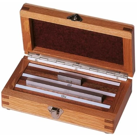 Parallel-Endmaß-Satz Stahl für Messschieber und Höhenreißer • Anwendung: Zum speziellen Prüfen und Kalibrieren von Messschiebern und Höhenreißern. • Ausführung: aus hochwertigem. gealterten SpezialstahlgehärtethandgeläpptEndmaße sind mit einer Identifikationsnummer beschriftetfür Messschieber bis 150 mm • Vorteil: ideal zum Prüfen von Lehren und Messgeräten im Prüfraum • Lieferung: im hochwertigen Holzetui. mit Werkskalibrierschein ( DAkkS auf Anfrage )