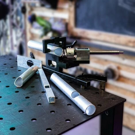 Der Werkzeugvorschub kann von Hand materialabhängig gesteuert werden. Der Winkel der Säge lässt sich in einem Bereich von 0°-50° Grad einstellen, sodass sowohl Gehrungsschnitte im Vollmaterial als auch am Rohrende vorgenommen werden können. Die Spindel für die Werkzeugaufnahme am Führungsbolzen hat ein ½“- Gewinde, sodass auch kleinere Schneidaufsätze genutzt werden können. Für größere Schneidaufsätze liegt der Lieferung ein Adapter von ½“ auf 5/8“ bei. So besteht die Möglichkeit, verschiedene Arten von Rohranschlüssen bequem und schnell herzustellen. Der Rohrausklinker kann mit handelsüblichen Handbohrmaschinen betrieben werden.
